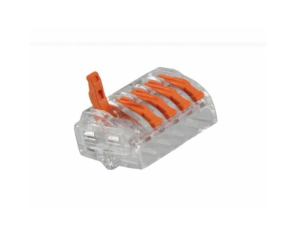 Conectorul rapid pentru instalații electrice 5 x 0,2 ÷ (2,5) 4,0 mm² este o alternativă la alte metode de conectare a cablurilor electrice, cum ar fi blocurile terminale pentru cabluri sau conexiunile tip bandă. Clienții îi aleg în principal pentru ușurința în utilizare. Acești conectori rapizi nu necesită șuruburi sau unelte. Pur și simplu introduceți firele în orificiu și fixați-le cu pârghiile de blocare.