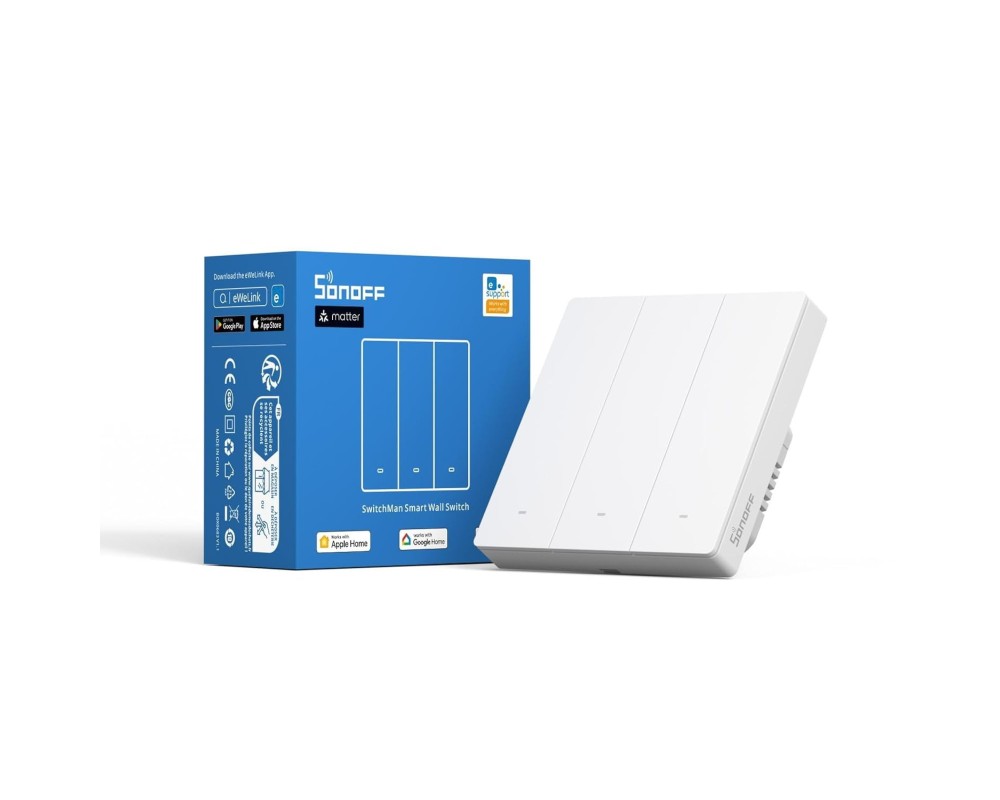 Sonoff M5-3C-80W este un întrerupător inteligent cu 3 canale, compatibil Matter, perfect pentru gestionarea modernă a iluminatului și a altor dispozitive electrice. Este ideal pentru integrarea în sisteme smart home și pentru utilizatorii care își doresc control complet de la distanță și comenzi vocale.