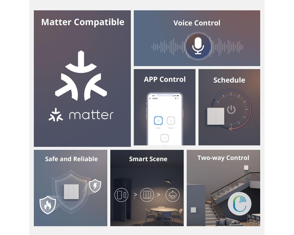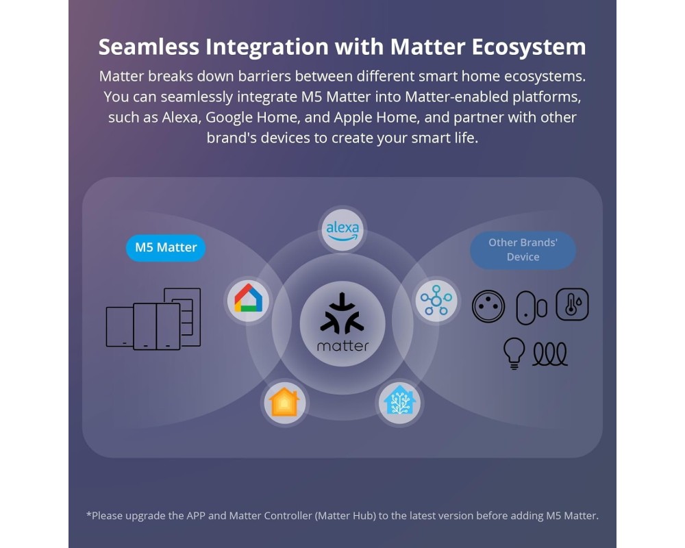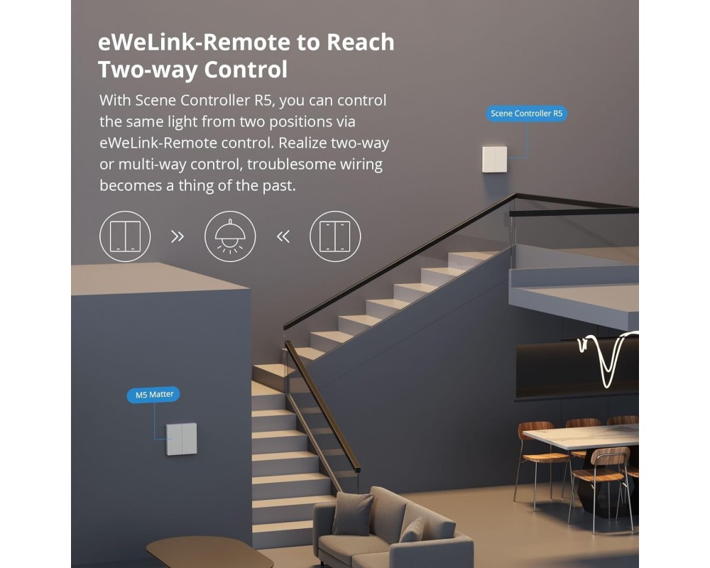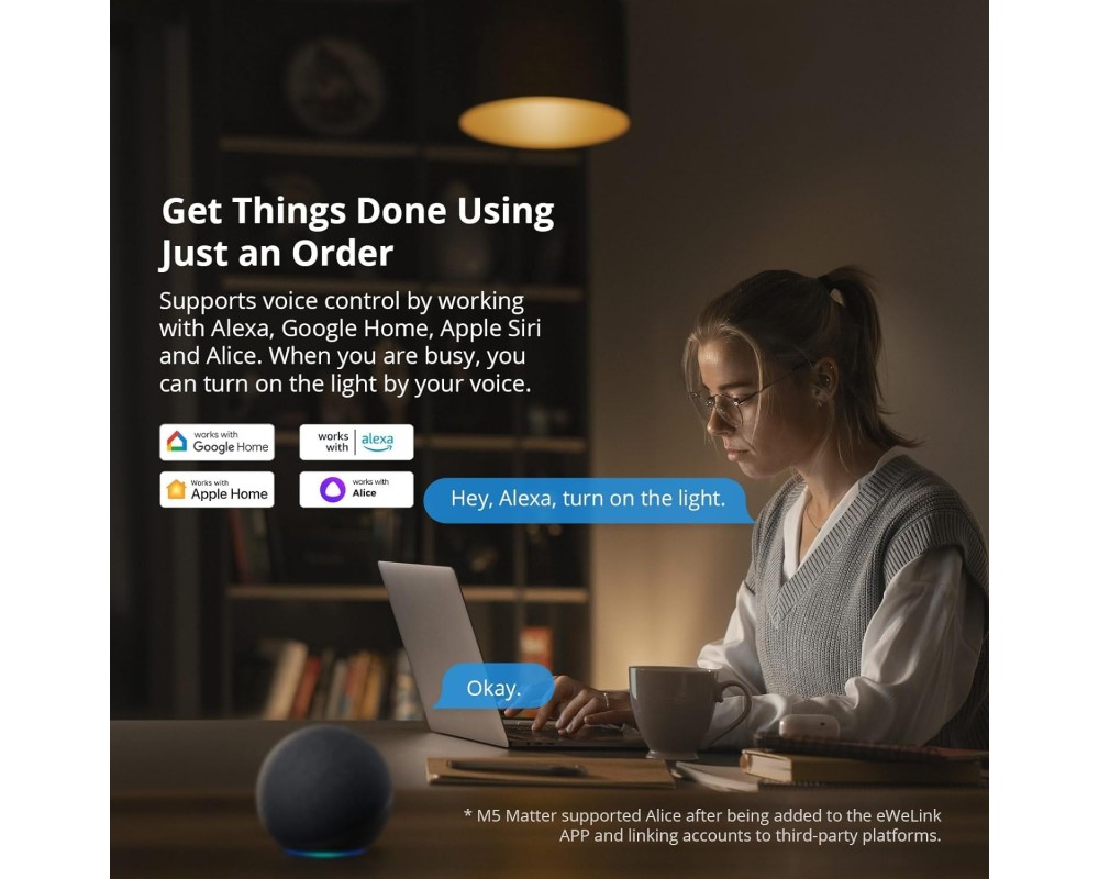 Datorită certificării Matter, Sonoff M5-3C-80W se integrează ușor cu ecosisteme precum Amazon Alexa, Google Home, Apple Home și alte dispozitive compatibile. Poți controla luminile simplu, cu o comandă vocală sau prin aplicația eWeLink.