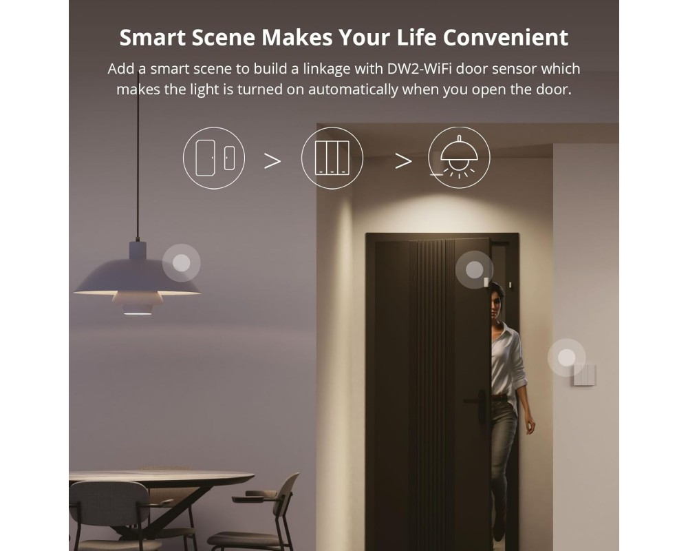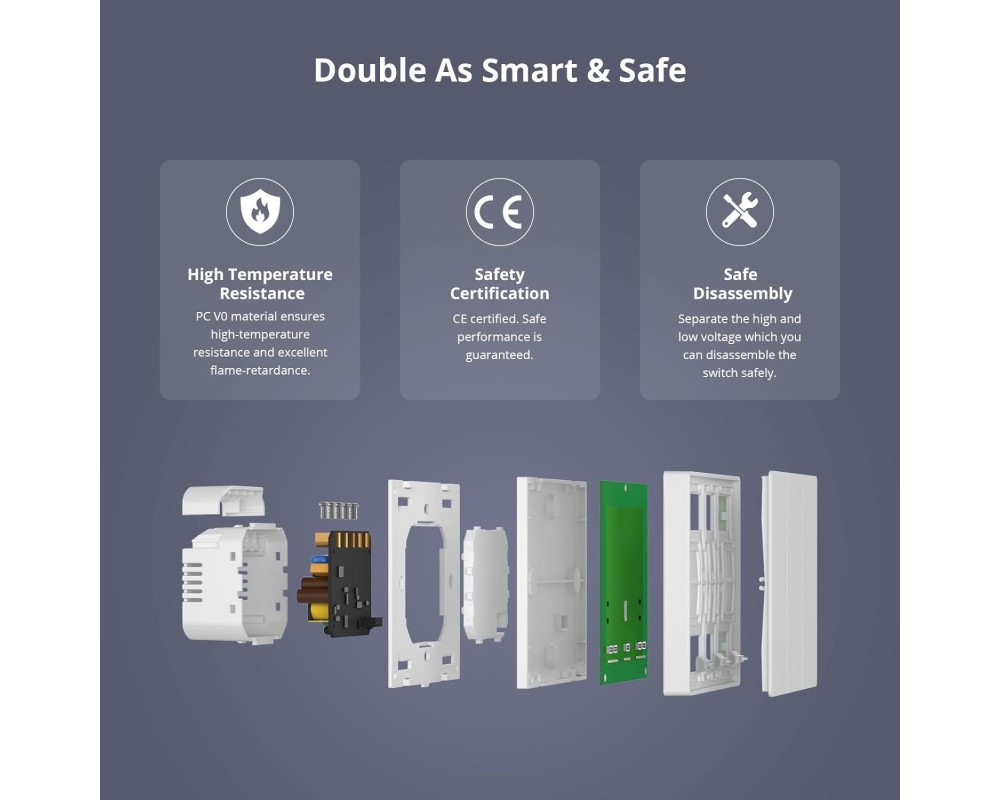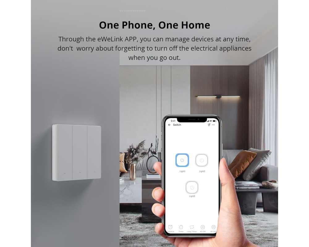 Prin aplicația eWeLink ai acces rapid la toate funcțiile întrerupătorului. Poți verifica în timp real starea circuitelor, poți seta programe sau scene inteligente și poți partaja accesul cu alți membri ai familiei. Butoanele fizice oferă control local convenabil.