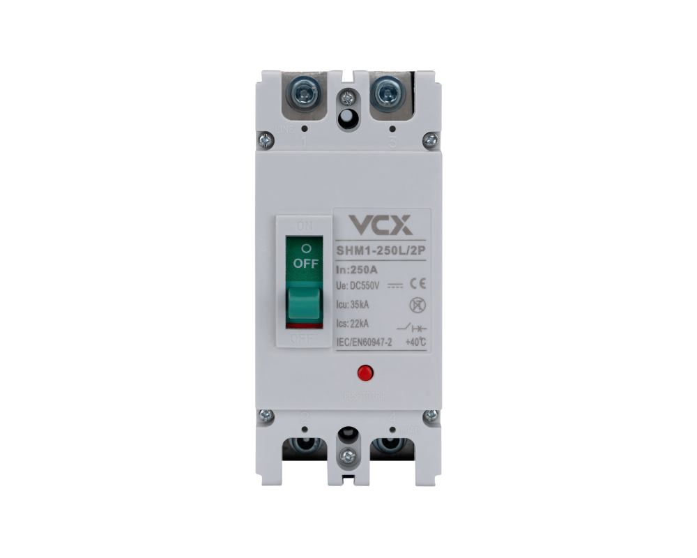 Întrerupătorul automat SHM1‑250L/2P MCCB 550 V CC 250 A este un întrerupător automat de curent continuu bipolar cu un curent nominal de 250 A, o capacitate de rupere la scurtcircuit de 35 kA, un timp de declanșare rapid de ≤ 20 ms și o funcție Push-to-Trip pentru deconectare manuală și testare.