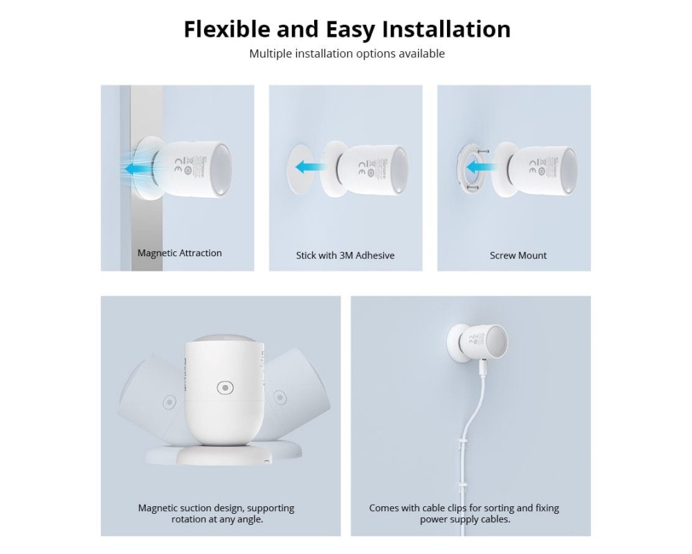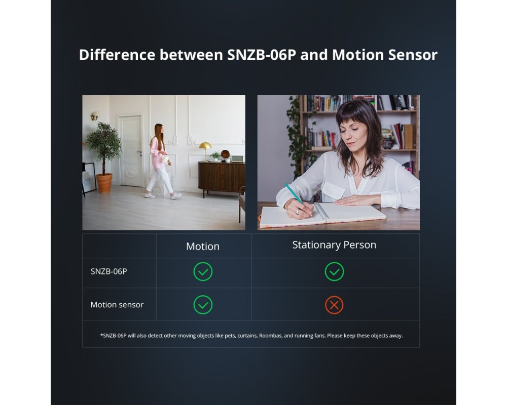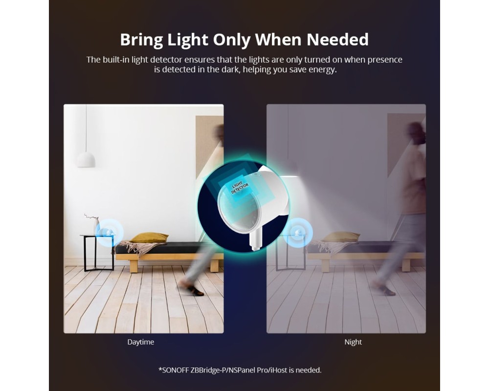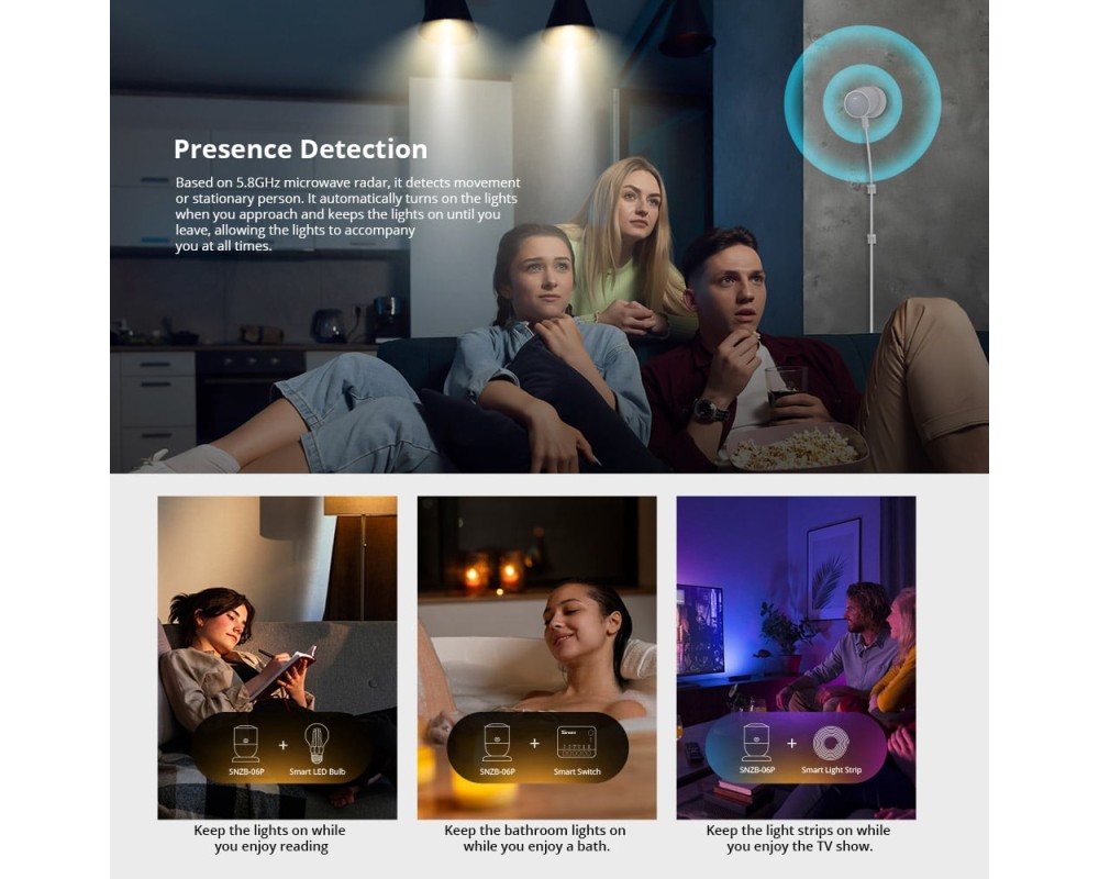 SNZB-06P bazat pe un radar cu microunde de 5,8 GHz, poate detecta miscarea sau persoana stationara. Aprinde automat luminile cand te apropii si tine luminile aprinse pana cand pleci.