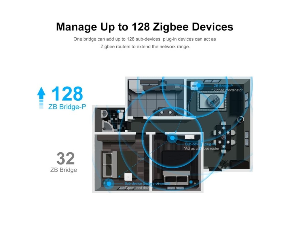 Acceptă până la 128 de sub-dispozitive: Zigbee Bridge Pro acceptă adăugarea de sub-dispozitive de pana la 128 de dispozitive fata de 32( modelul anterior fara PRO)